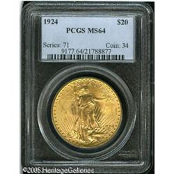 <B>1924 $20 MS64 PCGS.</B></I> Softly struck on the eagle's head and on Liberty's lower foot, with a noticeable abrasion across her abdomen. Soft frosted luster and attractive light coloration preserve the overall eye appeal of the piece. Lot:9681