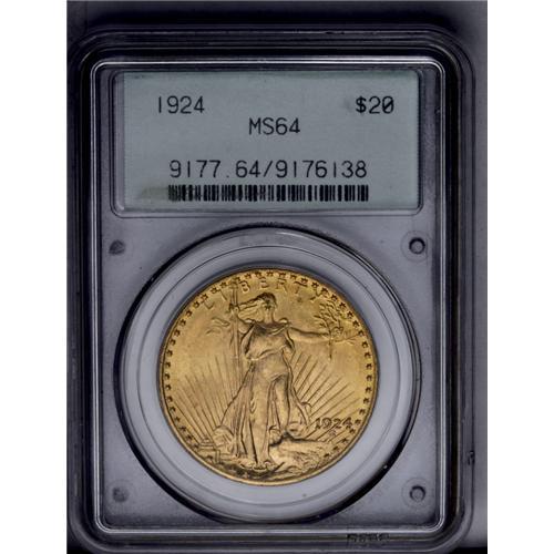 <B>1924<$20> MS64 PCGS.</B></I> The reverse of this lustrous green-gold type coin is beautifully preserved, and no obverse marks are worthy of mention. Housed in an early generation PCGS holder.