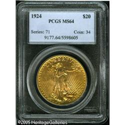 <B>1924 $20 MS64 PCGS.</B></I> Well struck throughout, with bright peach-orange patina over lustrous surfaces. The grade is limited by a few minute obverse contact marks. Lot:9680