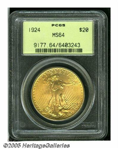 1924 $20 MS64 PCGS. Well struck with bright, matt
