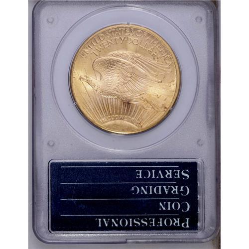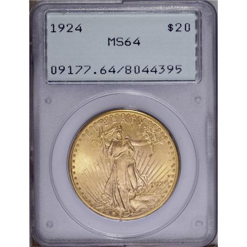 <B>1924<$20> MS64 PCGS.</B></I> Yellow-gold surfaces display a few darker orange-gold toning spots, and a few small abrasions on Liberty's chest and legs. The design elements are adequately brought up throughout. Housed in a first generation PCGS holder. <BR><BR><B>Important notice:</B> Heritage usually auctions material at the rate of 200-250 lots per hour. On some occasions eBay Live bid software or the Internet may not be able to keep up with the pace of the auction. We recommend placing a realistic absentee bid now as insurance to avoid disappointment. Occasionally the auctioneer may eliminate or reject an eBay Live bid, and the auctioneer may also reopen a lot after the close of the eBay live bidding (usually because we missed an audience bid), and may reject your bid even if it shows you as the winning bidder. By bidding via eBay Live, you agree that Heritage may award the lot to another bidder at its sole discretion under the circumstances described above or any other reasonable circumstances. Since eBay bids are not shown to us until we open the lot on the floor, we treat those bids just like floor bids. In most cases the floor responds before the eBay bid is presented to us, due to Internet lag time, so for consistency we have made it a policy that floor bids are always considered first over tie eBay live bids. Also please note that all Heritage lots purchased through eBay Live carry a 20% Buyer's Premium. Please make sure you read the Terms and Conditions before you bid. This lot is being auctioned in conjunction with a live floor auction by Heritage Galleries & Auctioneers. All final auction and invoice information will be supplied by Heritage Galleries & Auctioneers, and all other information should be considered preliminary. Lot:4698 <BR><BR><B>Winning Notification and Billing:</B> After the FINAL session in this auction is complete, Heritage will send e-mail and snail mail invoices. This process normally takes several days. All final auction and invoice information will be supplied by Heritage Galleries & Auctioneers, and all other information should be considered preliminary. <BR><BR>This auction will be conducted on a live auction floor and over the Internet through eBay Live. If you choose to place an absentee bid, please take a moment to <font color='#0000ff'><u><a href='http://pages.ebay.com/liveauctions/help/before/laabsentee.html'>learn how eBay Live absentee bidding works</a></u></font><font color='#000000'>