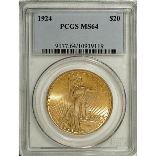 <B>1924 $20 MS64 PCGS.</B></I> A boldly struck sun-gold type coin with potent cartwheel shimmer and minor obverse field luster grazes.<BR><BR><b>Shipping:</b> Coins & Currency (<a target="_blank" href="http://www.heritageauctions.com/common/shipping.php">view shipping information</a>)