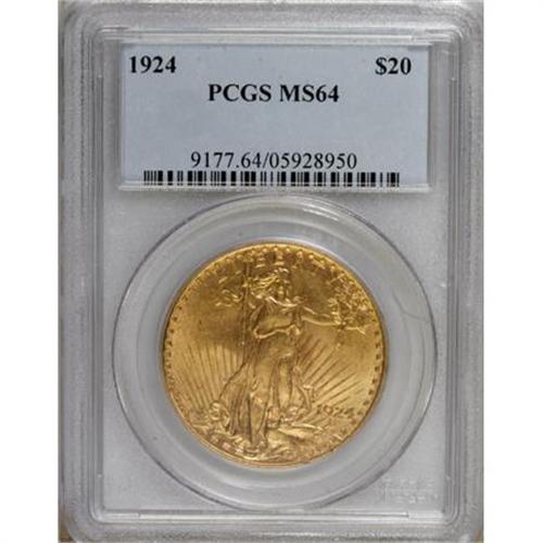 <B>1924 $20 MS64 PCGS.</B></I> PCGS Population (53197/32038). NGC Census: (82311/29241). Mintage: 4,323,500. Numismedia Wsl. Price for NGC/PCGS coin in MS64: $860. (#9177)<BR><BR><B>Coin Engraver:</B> Augustus Saint-Gaudens<BR><BR><b>Shipping:</b> Coins & Currency (<a target="_blank" href="http://www.heritageauctions.com/common/shipping.php">view shipping information</a>\)