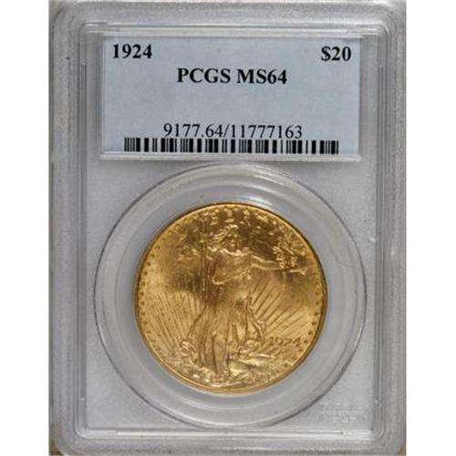 <B>1924 $20 MS64 PCGS.</B></I> PCGS Population (55160/34568). NGC Census: (82718/29478). Mintage: 4,323,500. Numismedia Wsl. Price for NGC/PCGS coin in MS64: $840. (#9177)<BR><BR><B>Coin Engraver:</B> Augustus Saint-Gaudens<BR><BR><b>Shipping:</b> Coins & Currency (<a target="_blank" href="http://www.heritageauctions.com/common/shipping.php">view shipping information</a>)