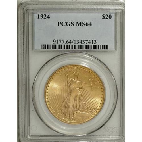 <B>1924 $20 MS64 PCGS.</B></I> PCGS Population (55728/34716). NGC Census: (83040/29615). Mintage: 4,323,500. Numismedia Wsl. Price for NGC/PCGS coin in MS64: $845. (#9177)<BR><BR><B>Coin Engraver:</B> Augustus Saint-Gaudens<BR><BR><b>Shipping:</b> Coins & Currency (<a target="_blank" href="http://www.heritageauctions.com/common/shipping.php">view shipping information</a>)