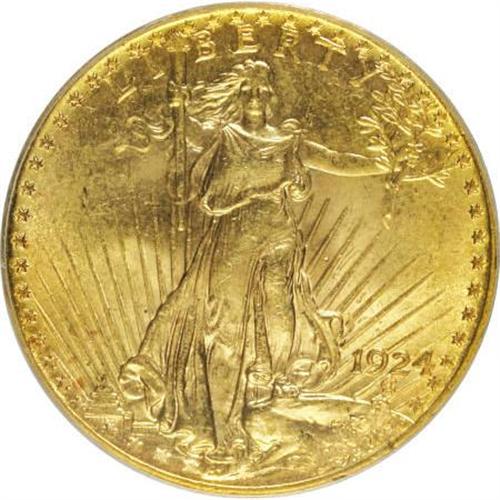 <B>1924 $20 MS64 PCGS.</B></I> PCGS Population (56142/35829). NGC Census: (83040/29615). Mintage: 4,323,500. Numismedia Wsl. Price for NGC/PCGS coin in MS64: $845. (#9177)<BR><BR><BR><B>Coin Engraver:</B> Augustus Saint-Gaudens<BR><BR><b>Shipping:</b> Coins & Currency (<a target="_blank" href="http://www.heritageauctions.com/common/shipping.php">view shipping information</a>)