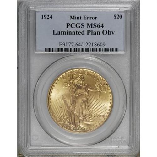 <B>1924 $20 Double Eagle--Laminated Planchet Obverse--MS64 PCGS.</B></I> (#9177)<BR><BR><B>Coin Engraver:</B> Augustus Saint-Gaudens<BR><BR><b>Shipping:</b> Coins & Currency (<a target="_blank" href="http://www.heritageauctions.com/common/shipping.php">view shipping information</a>)