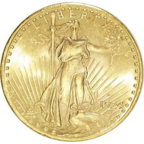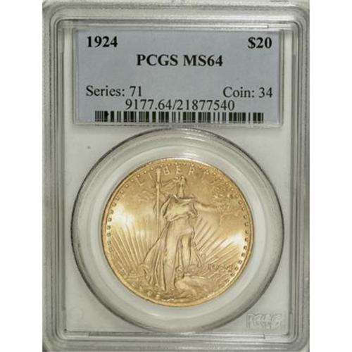 <B>1924 $20 MS64 PCGS.</B></I> PCGS Population (59600/38110). NGC Census: (84700/30331). Mintage: 4,323,500. Numismedia Wsl. Price for NGC/PCGS coin in MS64: $1,210. (#9177)<BR><BR><B>Coin Engraver:</B> Augustus Saint-Gaudens<BR><BR><b>Shipping:</b> Coins & Currency (<a target="_blank" href="http://www.heritageauctions.com/common/shipping.php">view shipping information</a>)