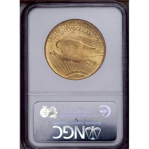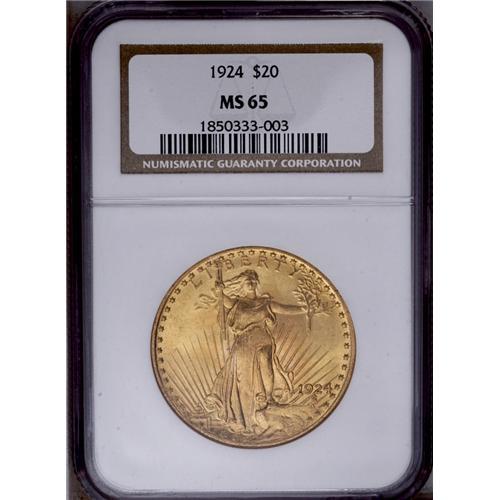 <B>1924<$20> MS65 NGC.</B></I> A softly lustrous coin with a small copper spot on Liberty's waist. A well struck Gem with beautifully preserved yellow-gold fields that have a touch of red.