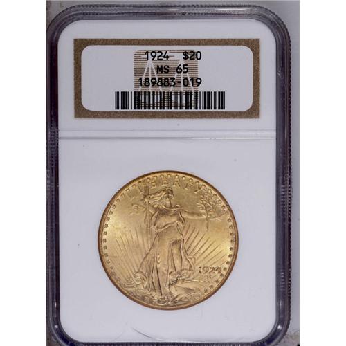 <B>1924<$20> MS65 NGC.</B></I> The 1924 is a common date, and a few obverse luster grazes are present, but this original olive-gold and apricot type coin is nonetheless lustrous and highly attractive.
