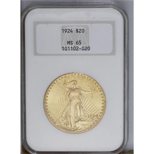 <B>1924 $20 MS65 NGC.</B></I> This lovely Gem displays beautiful creamy luster accented by rich pink-orange and yellow-green coloration on both sides. Generally well preserved overall, but a small abrasion is noted for the sake of accuracy in the left obverse field, not far from the base of Liberty's torch.