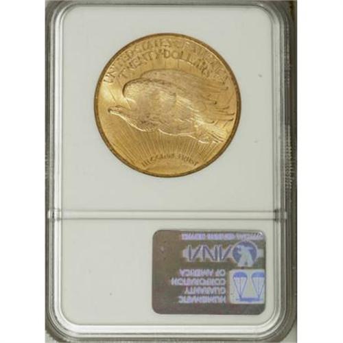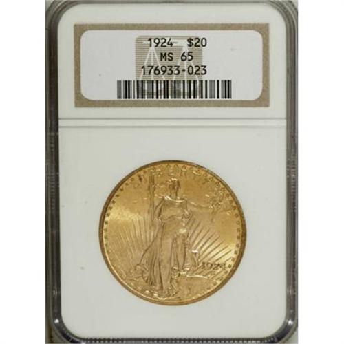 <B>1924 $20 MS65 NGC.</B></I> A rich satiny sheen enlivens the lime-gold and peach surfaces. The design motifs are crisply defined. Minimal surface marks are found on either side of this lovely Gem. <BR><BR><b>Shipping:</b> Coins & Currency (<a target="_blank" href="http://www.heritageauctions.com/common/shipping.php">view shipping information</a>)