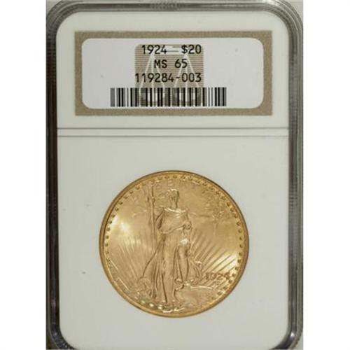 <B>1924 $20 MS65 NGC.</B></I> NGC Census: (25776/3465). PCGS Population (25510/6528). Mintage: 4,323,500. Numismedia Wsl. Price for NGC/PCGS coin in MS65: $1,230. (#9177)<BR><BR><B>Coin Engraver:</B> Augustus Saint-Gaudens<BR><BR><b>Shipping:</b> Coins & Currency (<a target="_blank" href="http://www.heritageauctions.com/common/shipping.php">view shipping information</a>\)