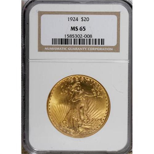 <B>1924 $20 MS65 NGC.</B></I> NGC Census: (25924/3554). PCGS Population (27695/6873). Mintage: 4,323,500. Numismedia Wsl. Price for NGC/PCGS coin in MS65: $1,240. (#9177)<BR><BR><B>Coin Engraver:</B> Augustus Saint-Gaudens<BR><BR><b>Shipping:</b> Coins & Currency (<a target="_blank" href="http://www.heritageauctions.com/common/shipping.php">view shipping information</a>)