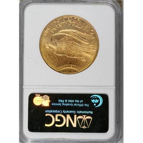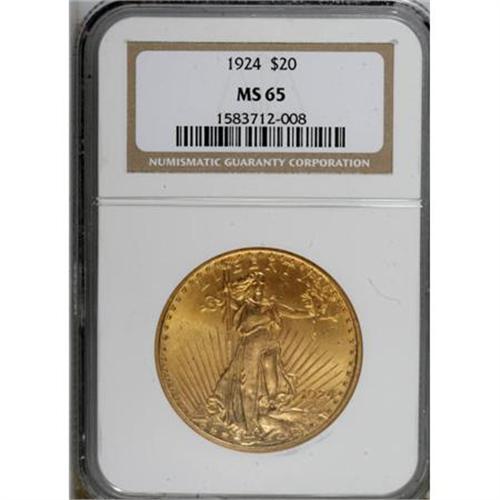 <B>1924 $20 MS65 NGC.</B></I> NGC Census: (26044/3571). PCGS Population (28374/6970). Mintage: 4,323,500. Numismedia Wsl. Price for NGC/PCGS coin in MS65: $1,220. (#9177)<BR><BR><B>Coin Engraver:</B> Augustus Saint-Gaudens<BR><BR><b>Shipping:</b> Coins & Currency (<a target="_blank" href="http://www.heritageauctions.com/common/shipping.php">view shipping information</a>)