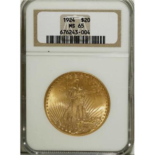 <B>1924 $20 MS65 NGC.</B></I> A solidly struck and satiny orange-gold double eagle that offers excellent eye appeal. A pleasingly preserved and interesting example of this popular type issue.<BR><I>From The Florissant Collection.</B></I><BR><BR><B>Coin Engraver:</B> Augustus Saint-Gaudens<BR><BR><b>Shipping:</b> Coins & Currency (<a target="_blank" href="http://www.heritageauctions.com/common/shipping.php">view shipping information</a>)