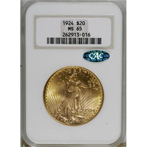 <B>1924 $20 MS65 NGC.</B></I> <B>CAC.</B></I> NGC Census: (26681/3736). PCGS Population (30945/7202). Mintage: 4,323,500. Numismedia Wsl. Price for NGC/PCGS coin in MS65: $1,490. (#9177)<BR><BR><B>Coin Engraver:</B> Augustus Saint-Gaudens<BR><BR><b>Shipping:</b> Coins & Currency (<a target="_blank" href="http://www.heritageauctions.com/common/shipping.php">view shipping information</a>)