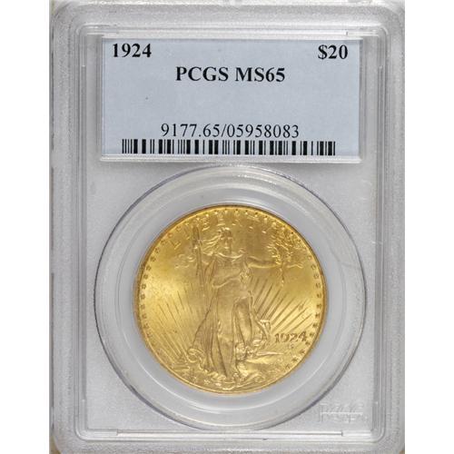 <B>1924 $20 MS65 PCGS.</B></I> A glowing yellow-orange example of this ever-popular type issue, well struck with judiciously preserved surfaces. Its mintage of 4,323,500 pieces is considerable, yet less than half the production that took place in 1928.<BR><BR><b>Shipping:</b> Coins & Currency (<a target="_blank" href="http://www.heritageauctions.com/common/shipping.php">view shipping information</a>)