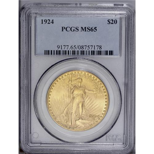 <B>1924<$20> MS65 PCGS.</B></I> A lovely Gem example of this popular and available issue, with lemon-yellow surfaces, brilliant luster, and a moderate strike.