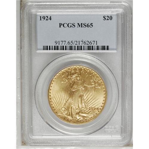 <B>1924<$20> MS65 PCGS.</B></I> A lovely straw-gold Gem example of this sought-after issue. Sharply struck and quite lustrous with the clean devices demanded of the grade.