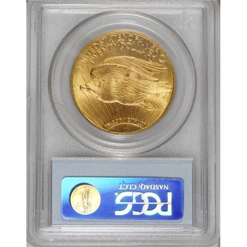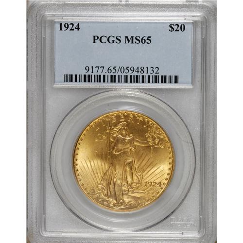 <B>1924 $20 MS65 PCGS.</B></I> A luminous green-gold piece whose unblemished appearance proclaims its undeniable eye appeal. A small mint-produced strike-through above the seventh ray will identify this gold type coin.<BR><BR><b>Shipping:</b> Coins & Currency (<a target="_blank" href="http://www.heritageauctions.com/common/shipping.php">view shipping information</a>)