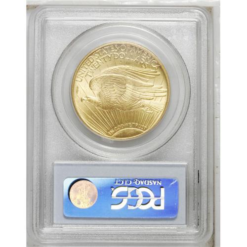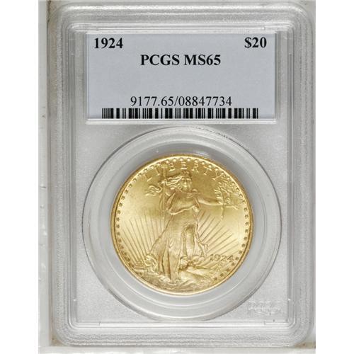 <B>1924<$20> MS65 PCGS.</B></I> A pale lemon-yellow piece with unusually subdued luster for this issue. Solidly struck with only a few tiny marks on each side, none individually distracting.