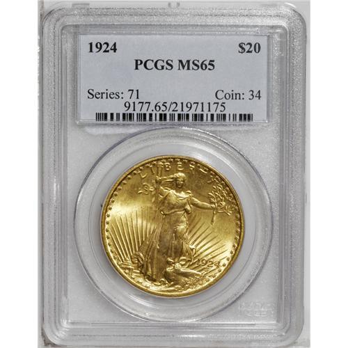 <B>1924<$20> MS65 PCGS.</B></I> An amazing Gem quality example of this popular date, often chosen by type collectors to represent the Saint-Gaudens design. This example is sharply struck and fully lustrous with satiny surfaces and lovely green-gold color.