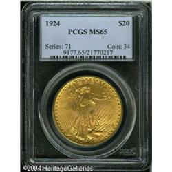 1924 $20 MS65 PCGS. An impressive Gem that is devo <B>1924 $20 MS65 PCGS.</B></I> An impressive Gem that is devoid of relevant marks and delivers unbroken cartwheel luster. The strike is good although not needle-sharp. <BR><BR><B>Important notice:</B> Heritage usually auctions material at the rate of 200-250 lots per hour. On some occasions eBay Live bid software or the Internet may not be able to keep up with the pace of the auction. We recommend placing a realistic absentee bid now as insurance to avoid disappointment. Occasionally the auctioneer may eliminate or reject an eBay Live bid, and the auctioneer may also reopen a lot after the close of the eBay live bidding (usually because we missed an audience bid), and may reject your bid even if it shows you as the winning bidder. By bidding via eBay Live, you agree that Heritage may award the lot to another bidder at its sole discretion under the circumstances described above or any other reasonable circumstances. Since eBay bids are not shown to us until we open the lot on the floor, we treat those bids just like floor bids. In most cases the floor responds before the eBay bid is presented to us, due to Internet lag time, so for consistency we have made it a policy that floor bids are always considered first over tie eBay live bids. Also please note that all Heritage lots purchased through eBay Live carry a 20% Buyer's Premium. Please make sure you read the Terms and Conditions before you bid. This lot is being auctioned in conjunction with a live floor auction by Heritage Galleries & Auctioneers. All final auction and invoice information will be supplied by Heritage Galleries & Auctioneers, and all other information should be considered preliminary. Lot:7219