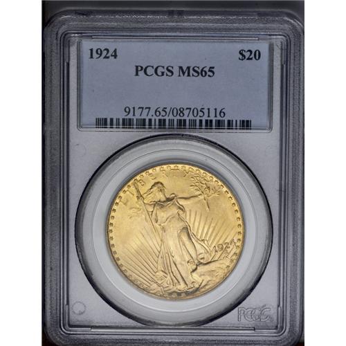 <B>1924<$20> MS65 PCGS.</B></I> An intense lemon-yellow coin with bright luster for this issue and subtle accents of khaki in the fields. A gorgeous piece that practically begs to be put in a fine type set.
