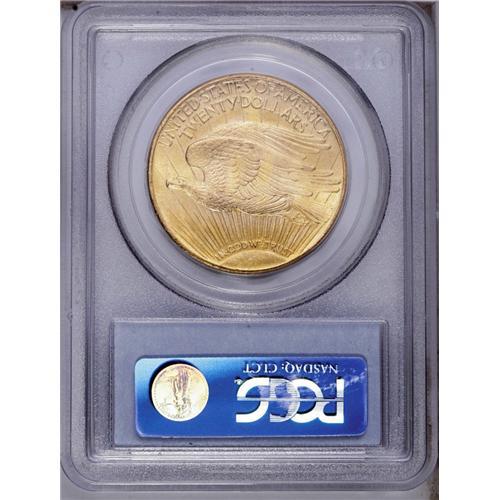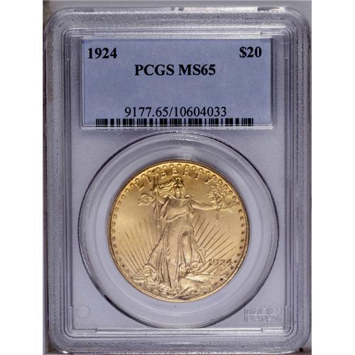 <B>1924<$20> MS65 PCGS.</B></I> Apricot-gold surfaces yield nice luster, and display a pebbly-like texture on the reverse. The design features are well impressed throughout. A few small marks on the rims do not distract. <BR><BR><B>Important notice:</B> Heritage usually auctions material at the rate of 200-250 lots per hour. On some occasions eBay Live bid software or the Internet may not be able to keep up with the pace of the auction. We recommend placing a realistic absentee bid now as insurance to avoid disappointment. Occasionally the auctioneer may eliminate or reject an eBay Live bid, and the auctioneer may also reopen a lot after the close of the eBay live bidding (usually because we missed an audience bid), and may reject your bid even if it shows you as the winning bidder. By bidding via eBay Live, you agree that Heritage may award the lot to another bidder at its sole discretion under the circumstances described above or any other reasonable circumstances. Since eBay bids are not shown to us until we open the lot on the floor, we treat those bids just like floor bids. In most cases the floor responds before the eBay bid is presented to us, due to Internet lag time, so for consistency we have made it a policy that floor bids are always considered first over tie eBay live bids. Also please note that all Heritage lots purchased through eBay Live carry a 20% Buyer's Premium. Please make sure you read the Terms and Conditions before you bid. This lot is being auctioned in conjunction with a live floor auction by Heritage Galleries & Auctioneers. All final auction and invoice information will be supplied by Heritage Galleries & Auctioneers, and all other information should be considered preliminary. Lot:4706 <BR><BR><B>Winning Notification and Billing:</B> After the FINAL session in this auction is complete, Heritage will send e-mail and snail mail invoices. This process normally takes several days. All final auction and invoice information will be supplied by Heritage Galleries & Auctioneers, and all other information should be considered preliminary. <BR><BR>This auction will be conducted on a live auction floor and over the Internet through eBay Live. If you choose to place an absentee bid, please take a moment to <font color='#0000ff'><u><a href='http://pages.ebay.com/liveauctions/help/before/laabsentee.html'>learn how eBay Live absentee bidding works</a></u></font><font color='#000000'>