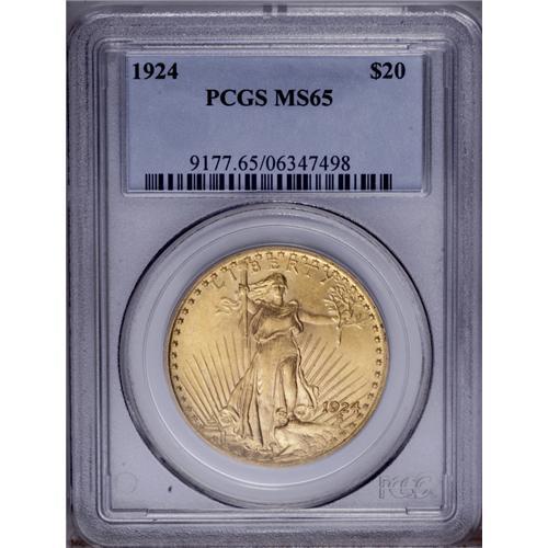 <B>1924<$20> MS65 PCGS.</B></I> Boldly struck except on Liberty's lower foot and the upper torch, the surfaces reveal softly frosted luster and pleasing olive-orange and rose toning. A handful of minute marks are noted on each side, but you will need a loupe to find them.