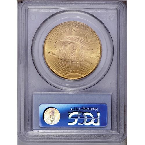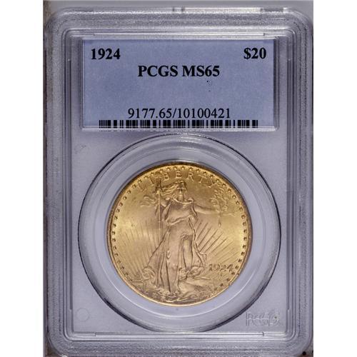 <B>1924<$20> MS65 PCGS.</B></I> From one of the most common dates in the Saint-Gaudens series, but still a pleasure to examine, this satiny Gem displays even, attractive coloration and soft luster. The striking details are consistently bold and contact remnants are positively minimal, confirming the MS65 grade assessment.