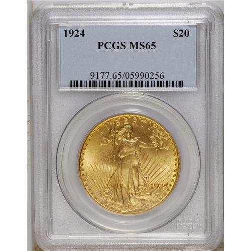 <B>1924 $20 MS65 PCGS.</B></I> Peach-gold luster adorns each side of this adequately struck Saint. A couple of minor obverse marks do not detract.<BR><BR><b>Shipping:</b> Coin/Currency (<a target="_blank" href="http://www.heritageauctions.com/common/shipping.php">view shipping information</a>)