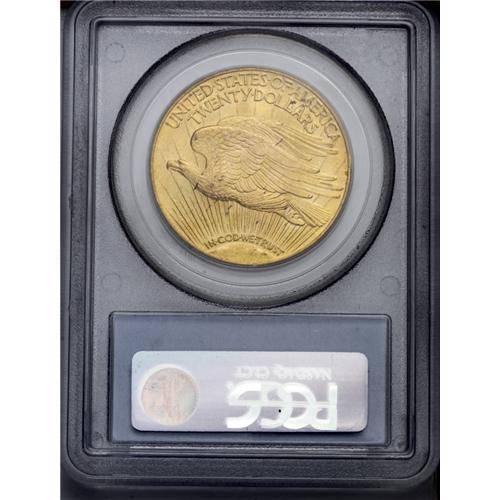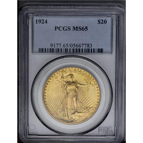 <B>1924<$20> MS65 PCGS.</B></I> Satiny and smooth like many of this issue, with tinges of olive and orange patina. The reverse has streaks of toning that range from magenta to violet.