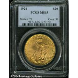 1924 $20 MS65 PCGS. The crisp strike and the absen <B>1924 $20 MS65 PCGS.</B></I> The crisp strike and the absence of detrimental marks contributes to the charms of this lustrous and lovely Gem. <BR><BR><B>Important notice:</B> Heritage usually auctions material at the rate of 200-250 lots per hour. On some occasions eBay Live bid software or the Internet may not be able to keep up with the pace of the auction. We recommend placing a realistic absentee bid now as insurance to avoid disappointment. Occasionally the auctioneer may eliminate or reject an eBay Live bid, and the auctioneer may also reopen a lot after the close of the eBay live bidding (usually because we missed an audience bid), and may reject your bid even if it shows you as the winning bidder. By bidding via eBay Live, you agree that Heritage may award the lot to another bidder at its sole discretion under the circumstances described above or any other reasonable circumstances. Since eBay bids are not shown to us until we open the lot on the floor, we treat those bids just like floor bids. In most cases the floor responds before the eBay bid is presented to us, due to Internet lag time, so for consistency we have made it a policy that floor bids are always considered first over tie eBay live bids. Also please note that all Heritage lots purchased through eBay Live carry a 20% Buyer's Premium. Please make sure you read the Terms and Conditions before you bid. This lot is being auctioned in conjunction with a live floor auction by Heritage Galleries & Auctioneers. All final auction and invoice information will be supplied by Heritage Galleries & Auctioneers, and all other information should be considered preliminary. Lot:7217