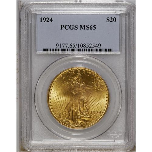 <B>1924 $20 MS65 PCGS.</B></I> The luminous surfaces of this lovely Gem exhibit bewitching peach-gold color, with faint greenish accents. Softly frosted luster illuminates well struck features. Both sides of the piece are minimally marked.<BR><BR><b>Shipping:</b> Coin/Currency (<a target="_blank" href="http://www.heritageauctions.com/common/shipping.php">view shipping information</a>)