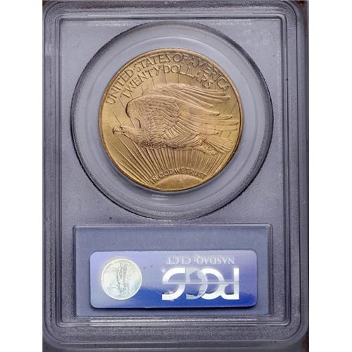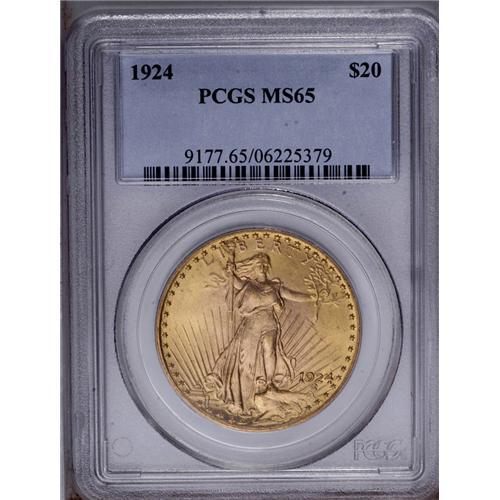 <B>1924<$20> MS65 PCGS.</B></I> This shimmering khaki-gold Gem is refreshingly free from marks, particularly on the open fields, which lack the grazes usually encountered on this available issue. Well struck aside from Liberty's nose.