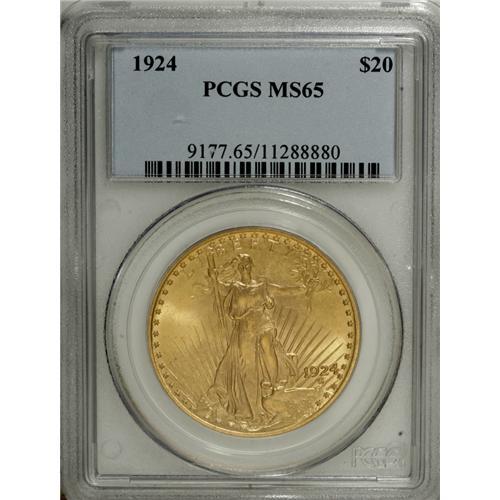 <B>1924 $20 MS65 PCGS.</B></I> This suitably struck honey-gold Gem has strong eye appeal despite slightly subdued luster. A light graze is noted below Liberty's branch.<BR><BR><b>Shipping:</b> Coins & Currency (<a target="_blank" href="http://www.heritageauctions.com/common/shipping.php">view shipping information</a>)