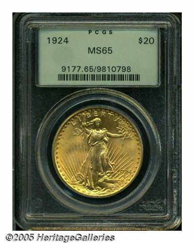<B>1924<$20> MS65 PCGS.</B></I> Well struck and highly lustrous, with beautiful light coloration and exquisitely preserved surfaces overall. If not for a single noticeable abrasion, between S and O on the upper reverse rim, the piece might grade even higher.