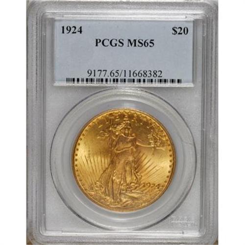 <B>1924 $20 MS65 PCGS.</B></I> The obverse has lime fields and an orange center. The reverse has even apricot toning. A lustrous type coin with minimal contact.<BR><BR><b>Shipping:</b> Coins & Currency (<a target="_blank" href="http://www.heritageauctions.com/common/shipping.php">view shipping information</a>)