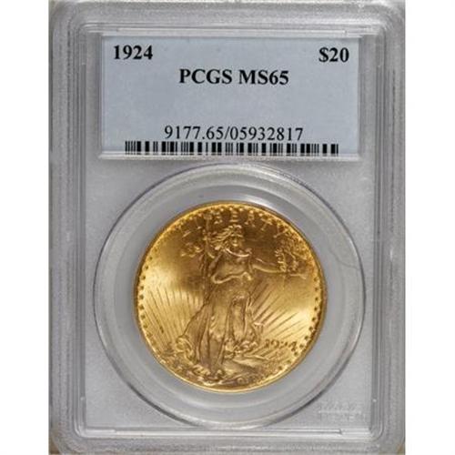<B>1924 $20 MS65 PCGS.</B></I> The obverse of this Gem has a hint of satin in the fields, but the reverse displays pure, sparkling brilliance. An immensely appealing lemon-gold example that should prove well-suited to a type or date set.<BR><BR><b>Shipping:</b> Coins & Currency (<a target="_blank" href="http://www.heritageauctions.com/common/shipping.php">view shipping information</a>)