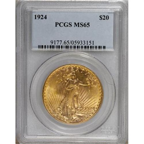 <B>1924 $20 MS65 PCGS.</B></I> One of the most available double eagle issues in Gem grade, the 1924 is one of the most popular choices for type collections. The surfaces of this strongly lustrous yellow-gold example exhibit splashes of orange color in the fields.<BR><BR><b>Shipping:</b> Coins & Currency (<a target="_blank" href="http://www.heritageauctions.com/common/shipping.php">view shipping information</a>)