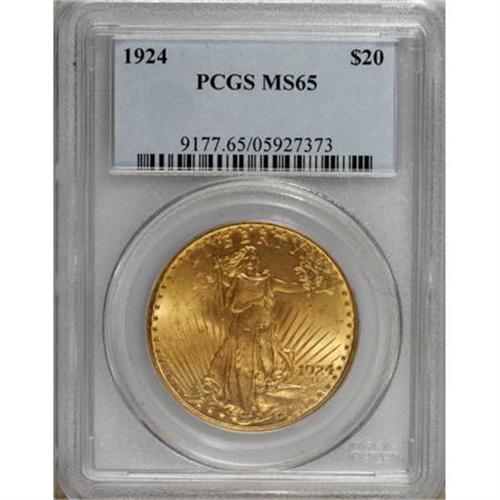 <B>1924 $20 MS65 PCGS.</B></I> PCGS Population (25510/6528). NGC Census: (25776/3465). Mintage: 4,323,500. Numismedia Wsl. Price for NGC/PCGS coin in MS65: $1,230. (#9177)<BR><BR><B>Coin Engraver:</B> Augustus Saint-Gaudens<BR><BR><b>Shipping:</b> Coins & Currency (<a target="_blank" href="http://www.heritageauctions.com/common/shipping.php">view shipping information</a>\)