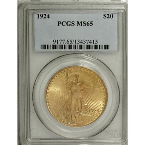<B>1924 $20 MS65 PCGS.</B></I> Delicate green-gold tints grace the otherwise sun-yellow surfaces of this type Gem. Solidly struck with a pleasing appearance and few marks in the fields on each side.<BR><BR><B>Coin Engraver:</B> Augustus Saint-Gaudens<BR><BR><b>Shipping:</b> Coins & Currency (<a target="_blank" href="http://www.heritageauctions.com/common/shipping.php">view shipping information</a>)