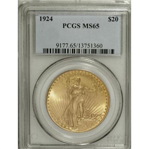 <B>1924 $20 MS65 PCGS.</B></I> Scarcely any marks appear in this type Gem's yellow-gold and apricot-gold fields, though a single flaw is noted on Liberty's knee. Well struck with an alloy spot present on the eagle's near wing.<BR><BR><B>Coin Engraver:</B> Augustus Saint-Gaudens<BR><BR><b>Shipping:</b> Coins & Currency (<a target="_blank" href="http://www.heritageauctions.com/common/shipping.php">view shipping information</a>)