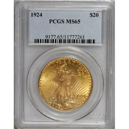 <B>1924 $20 MS65 PCGS.</B></I> PCGS Population (27695/6873). NGC Census: (25924/3554). Mintage: 4,323,500. Numismedia Wsl. Price for NGC/PCGS coin in MS65: $1,240. (#9177)<BR><BR><B>Coin Engraver:</B> Augustus Saint-Gaudens<BR><BR><b>Shipping:</b> Coins & Currency (<a target="_blank" href="http://www.heritageauctions.com/common/shipping.php">view shipping information</a>)