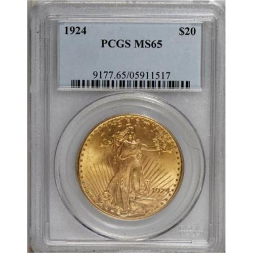 <B>1924 $20 MS65 PCGS.</B></I> PCGS Population (27872/6882). NGC Census: (26044/3571). Mintage: 4,323,500. Numismedia Wsl. Price for NGC/PCGS coin in MS65: $1,220. (#9177)<BR><BR><B>Coin Engraver:</B> Augustus Saint-Gaudens<BR><BR><b>Shipping:</b> Coins & Currency (<a target="_blank" href="http://www.heritageauctions.com/common/shipping.php">view shipping information</a>)