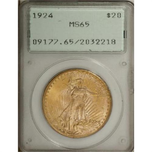 <B>1924 $20 MS65 PCGS.</B></I> Rich pinkish-gold luster with frosty mint surfaces. This piece is housed in a first generation PCGS holder. A lovely example of the date.<BR><BR><B>Coin Engraver:</B> Augustus Saint-Gaudens<BR><BR><b>Shipping:</b> Coins & Currency (<a target="_blank" href="http://www.heritageauctions.com/common/shipping.php">view shipping information</a>)