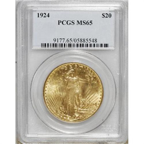 <B>1924 $20 MS65 PCGS.</B></I> . PCGS Population (30317/7177). NGC Census: (26641/3716). Mintage: 4,323,500. Numismedia Wsl. Price for NGC/PCGS coin in MS65: $1,420. (#9177)<BR><BR><B>Coin Engraver:</B> Augustus Saint-Gaudens<BR><BR><b>Shipping:</b> Coins & Currency (<a target="_blank" href="http://www.heritageauctions.com/common/shipping.php">view shipping information</a>)