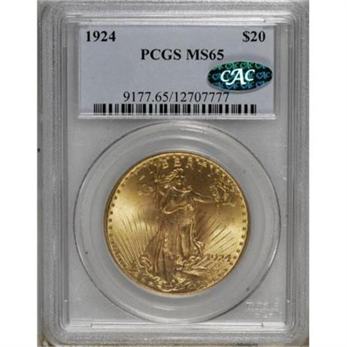 <B>1924 $20 MS65 PCGS.</B></I> <B>CAC.</B></I> PCGS Population (30945/7202). NGC Census: (26681/3736). Mintage: 4,323,500. Numismedia Wsl. Price for NGC/PCGS coin in MS65: $1,490. (#9177)<BR><BR><B>Coin Engraver:</B> Augustus Saint-Gaudens<BR><BR><b>Shipping:</b> Coins & Currency (<a target="_blank" href="http://www.heritageauctions.com/common/shipping.php">view shipping information</a>)